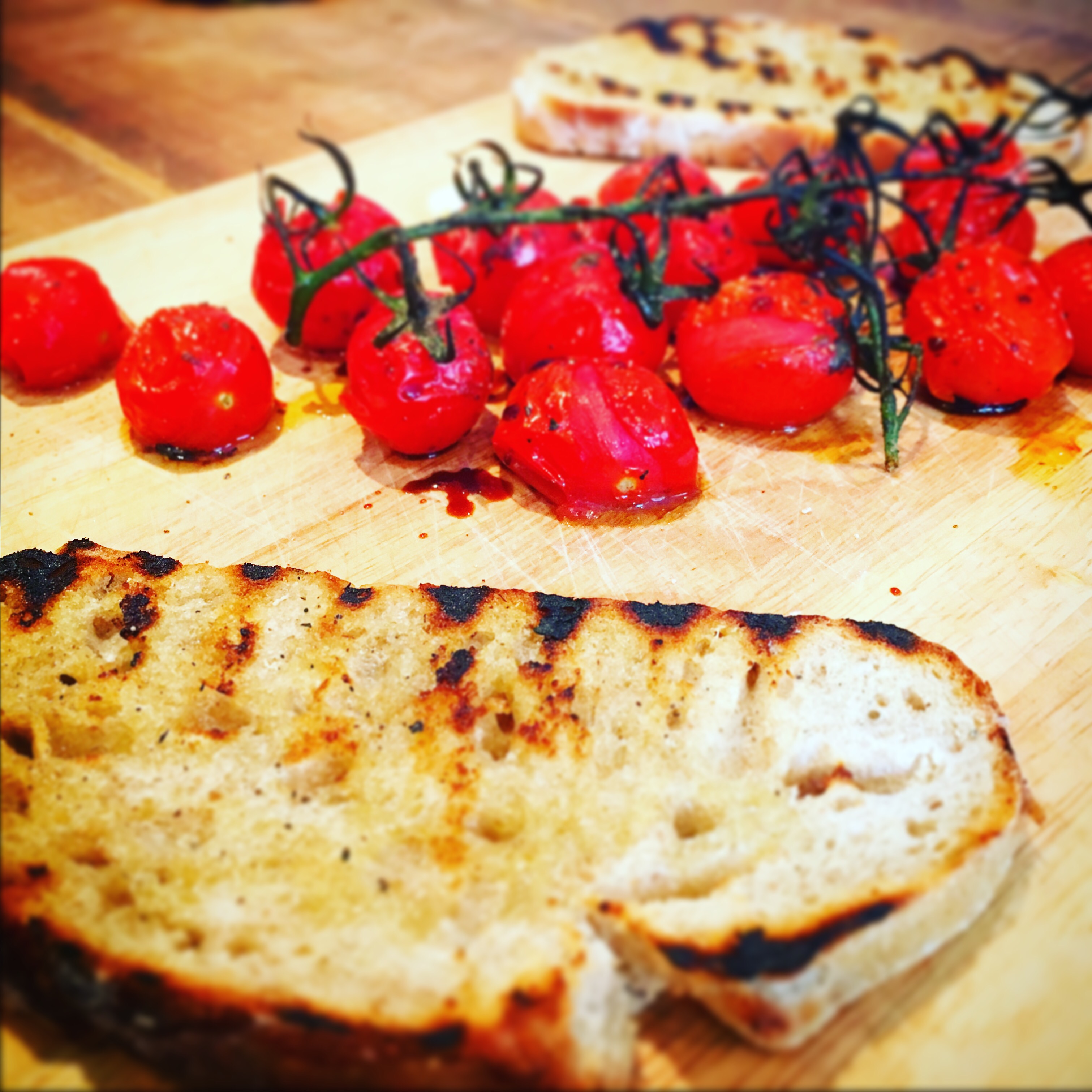 11. Take a couple of tomatoes either leave them whole and place them on the bread or squash them onto the bread so the juices are absorbed and enjoy!
