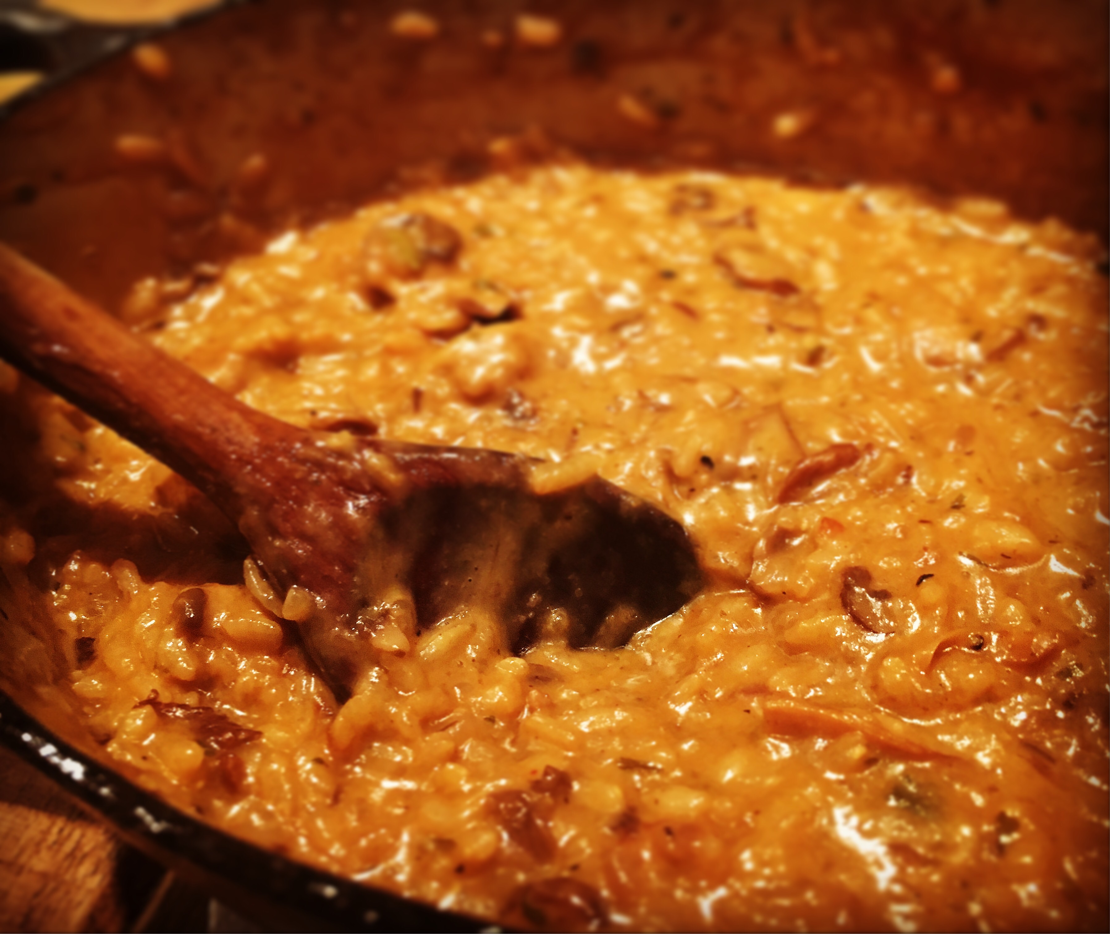14. If the dried mushrooms are now nice and soft add them to the risotto along with the water they were soaking in which will give the risotto a nice earthy rich flavour. Stir in and keep stirring. I also sometimes crumble a