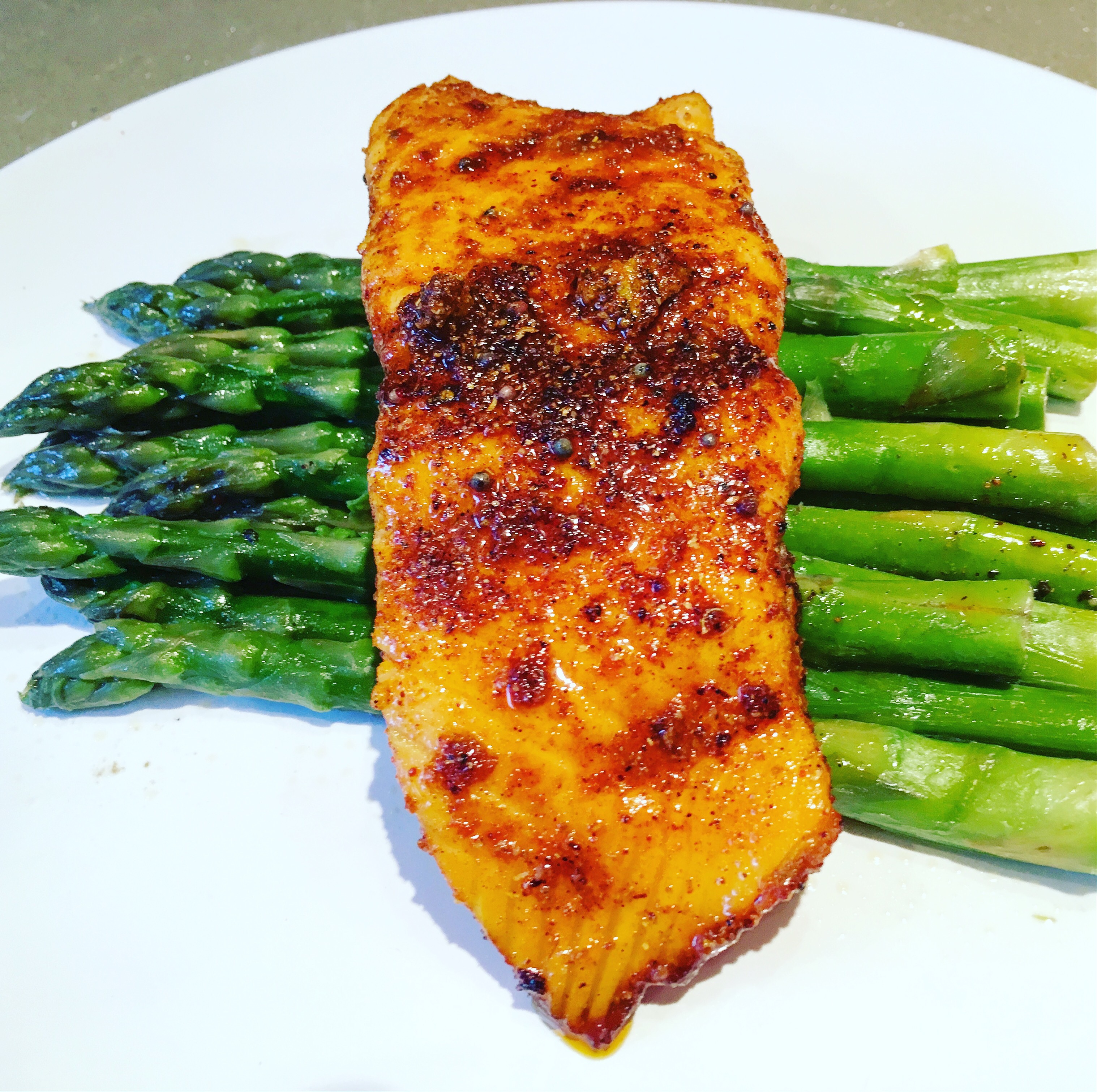 Blackened Indian Spiced Salmon with Mustard seed Poached Asparagus.